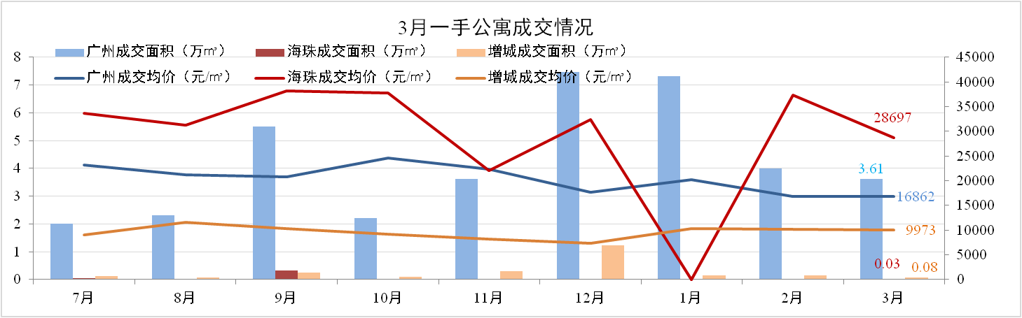 3月廣州一手公寓成交600套,成交面積3.61萬㎡,環(huán)比下跌0.3%。全市成交均價(jià)16,862元/㎡,環(huán)比上升2%。海珠、增城兩區(qū)成交量式微,價(jià)格保持穩(wěn)定。