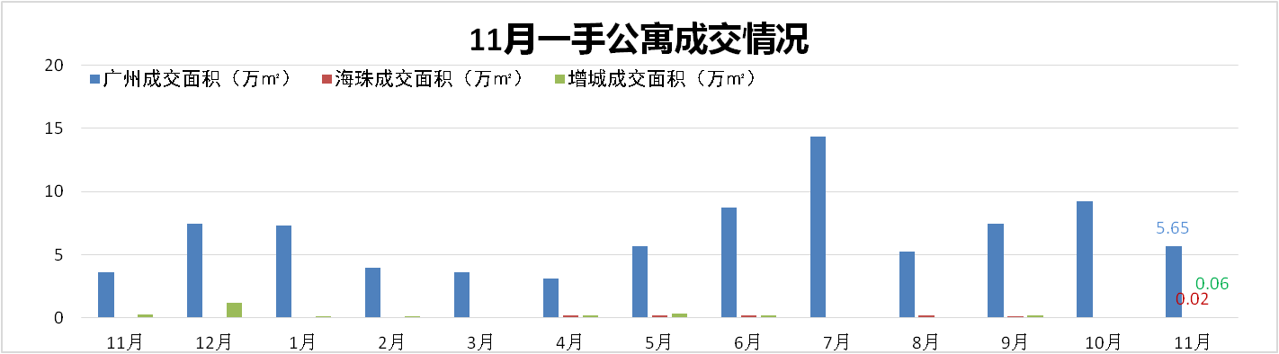 11月廣州一手公寓成交1,047套,成交面積5.65萬㎡,環(huán)比減少39%。海珠區(qū)成交面積0.02萬㎡,環(huán)比減少25%;增城區(qū)成交面積0.06萬㎡,環(huán)比減少36%。