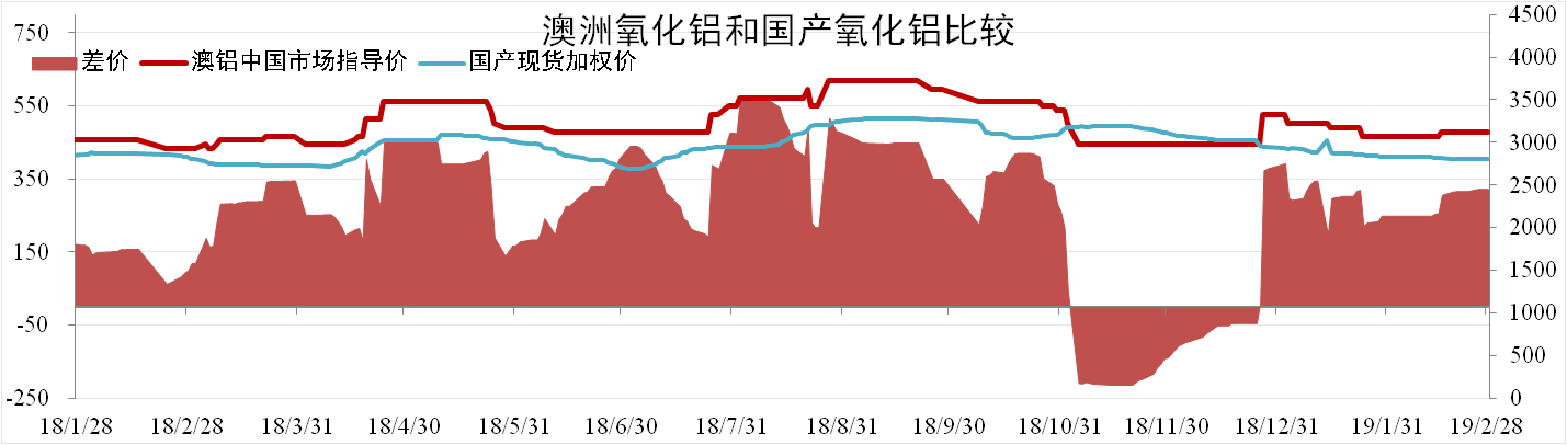 分析認(rèn)為:2月受國內(nèi)氧化鋁價(jià)格回落影響,與進(jìn)口氧化鋁價(jià)格差倒掛結(jié)束。2月國產(chǎn)氧化鋁價(jià)格持續(xù)回落,澳鋁中國市場指導(dǎo)價(jià)波動(dòng)較小,預(yù)計(jì)進(jìn)口氧化鋁價(jià)差緩慢拉大。