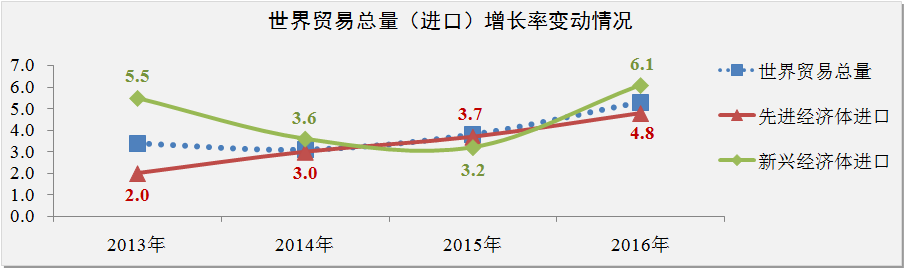 IMF數(shù)據(jù)顯示,2015-2016年世界貿(mào)易總量(貨物和服務(wù))將會(huì)出現(xiàn)較快增長(zhǎng)趨勢(shì),增長(zhǎng)率分別為3.8%和5.3%。受石油價(jià)格及大宗商品價(jià)格下跌對(duì)貿(mào)易條件和實(shí)際收入的負(fù)面影響,預(yù)計(jì)2015年新興經(jīng)濟(jì)體對(duì)世界貿(mào)易增長(zhǎng)的貢獻(xiàn)將低于先進(jìn)經(jīng)濟(jì)體,增長(zhǎng)率為3.2%。隨著負(fù)面影響逐步化解,預(yù)計(jì)2016年新興經(jīng)濟(jì)體的貿(mào)易增長(zhǎng)率將快速回升至6.1%。
