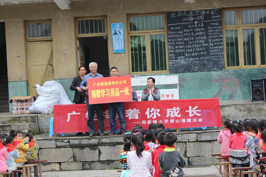2015年5月27日,在六•一國際兒童節(jié)來臨之際,為豐富孩子們的精神生活,讓留守兒童度過一個多姿多彩的節(jié)日,在清鎮(zhèn)市工會領(lǐng)導(dǎo)的帶領(lǐng)下,貴州廣鋁鋁業(yè)有限公司工會組織公司人資處、財務(wù)處、安環(huán)處等相關(guān)處室人員前往犁倭鎮(zhèn)周家橋小學(xué)開展愛心捐贈活動。